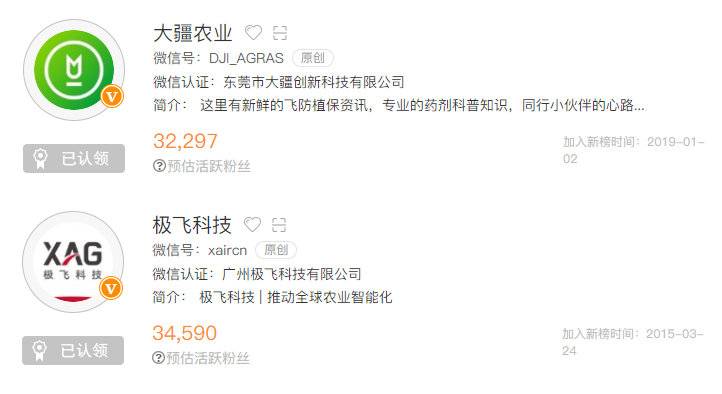 从两家农业无人机公司目前的公号影响力也在伯仲之间(公号粉丝主要是农飞经销商和各飞手组织)