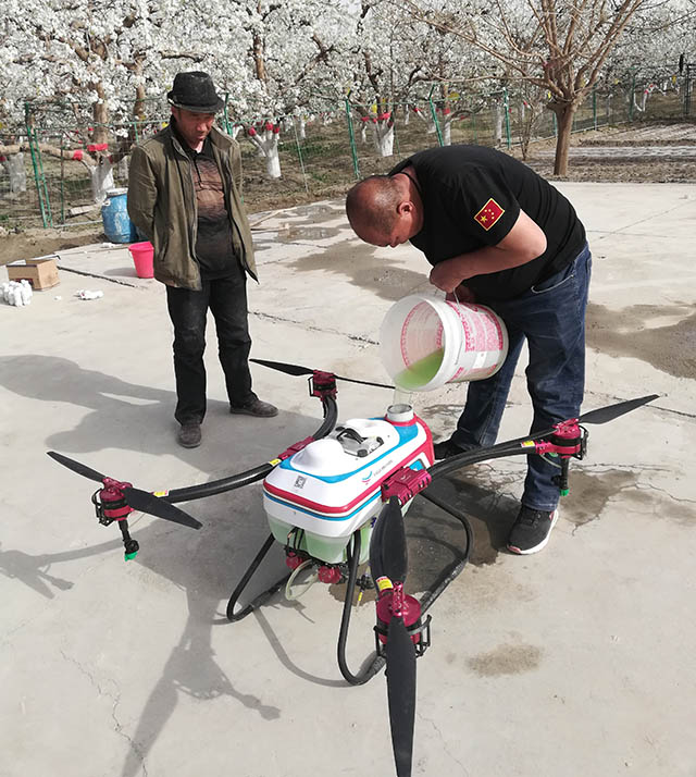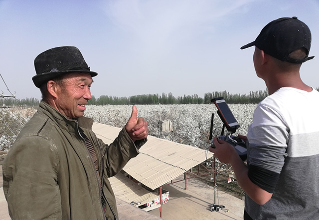 “过去一个人一天最多只能给一亩梨园人工授粉,遇到天气炎热导致花期短,还要雇更多工人帮忙,成本很高。现在使用无人机授粉,10亩梨园只需十几分钟就搞定了,省时省力省工。”梨农对无人机授粉的高效率赞叹不已。