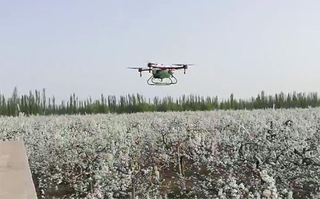 眼下,新疆阿克苏地区的梨树进入盛花期,4月10日,新疆天鹰兄弟植保飞防队携带无人机来到阿瓦提县多浪乡三组,用植保无人机为梨园进行喷洒授粉。