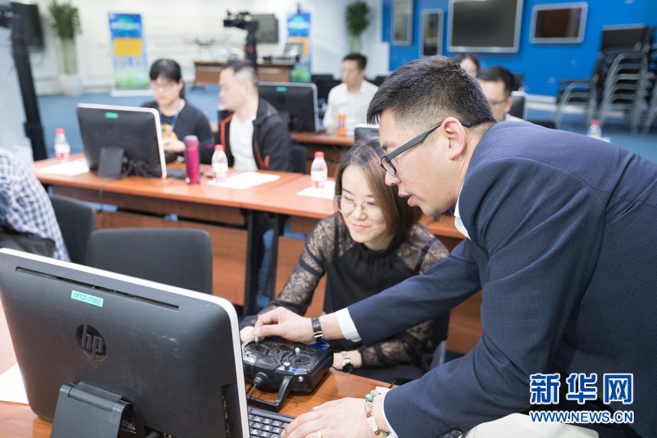 新华网无人机培训学院校长李远明辅导学员进行模拟飞行