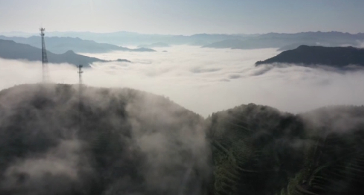 这几天的短暂降雨过后,永州双牌县上梧江瑶族乡云台山生态茶园的上空出现了连续的雾海景观,随着山风吹佛,雾海随风而动,时而聚集上下,时而飘向上的另一边,流动的雾海宛若悬挂在山林上的流云飞瀑一般,早已密切关注天气信息的摄影爱好者纷纷聚集守候在此,利用无人机拍下这一美丽景象。