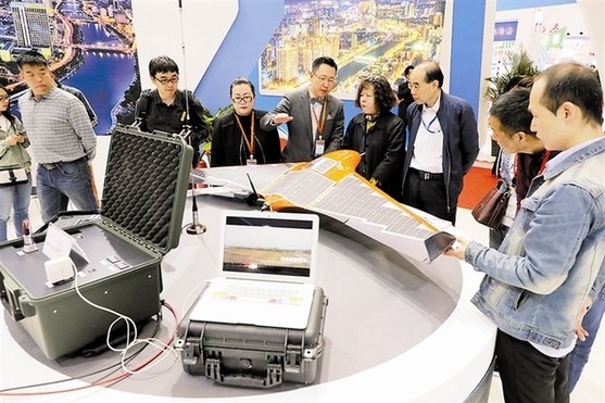 图为工作人员向观众介绍光伏无人机。