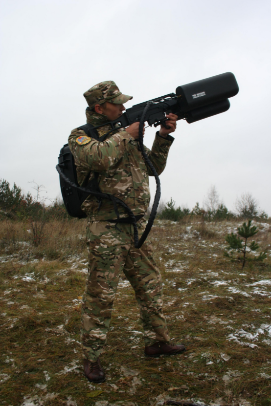 近年来白俄罗斯研制了包括Groza-R反无人机系统在内的多种反无人机武器,Groza-R系统主要由两部分组成:发射器,重约2千克,以步枪枪身为基础改装,前方装有3个天线,配有1个光学瞄准具;背包,重约8千克,内有干扰组件和电池,通过线缆与发射器相连。作用距离达5千米;能干扰2.4~ 2.485吉赫兹和5.76~ 5.88吉赫兹的无线电通信,作用距离2千米。整套系统可持续工作1小时。
