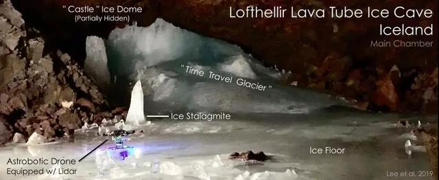 照片左下角是由天械科技公司研发的无人机,它搭载了LiDAR激光雷达技术。照片中它正停在冰面上,等待开始它的洞穴扫描任务。Credit: NASA/Astrobotic/SETI Institute/Dubai Future Foundation/Lee et al. 2019