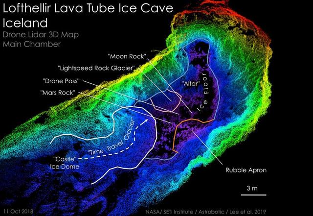 这次建模的对象是冰岛北部米湖区域的Lofthellir熔岩管冰洞,研究团队用无人机成功记录了此熔岩洞的形状、大小、岩石掉落历史和冰柱的形成。Lofthellir翻译成中文是空气洞,形成于3500年前的一次火山喷发,常年温度低于冰点的它有着永不融化的天然冰雕和壮丽的熔岩地形,吸引很多游客前来观赏。
