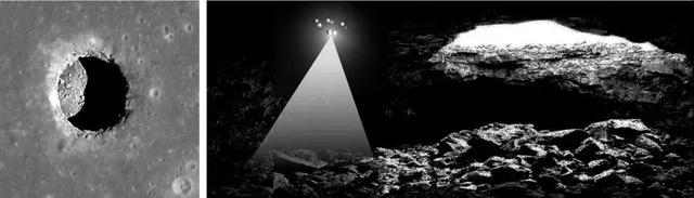 左:月球静海上一个直径80米的坑洞。Credit: NASA/LRO;右:艺术概念图,喷射式飞行器探索月球上的一个坑洞。Credit: Pascal Lee