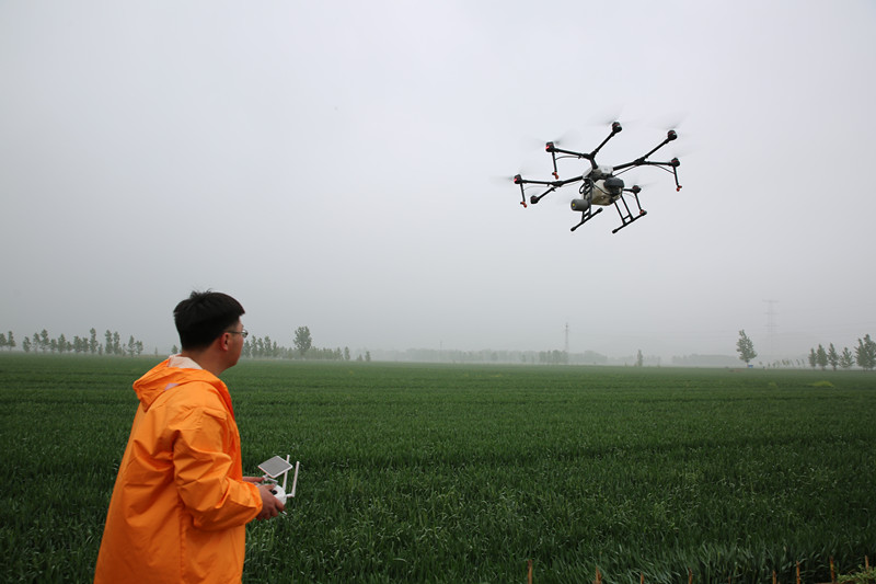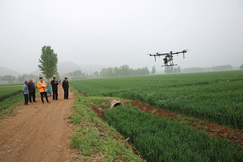 “用无人机打药效率真是太高了,10来亩地不到十来分钟的时间就打完了,不压小麦,喷洒均匀,真是又快又好!” 车路口村支书邵长华和村民们交谈着。