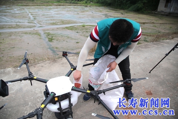 将晾干的水稻种子定量装进无人机货箱,开机、起飞、播撒……两架无人机在技术人员的操控下,沿着既定轨迹进行水稻直播,仅耗时5-6分钟就完成1亩地的水稻播种。
