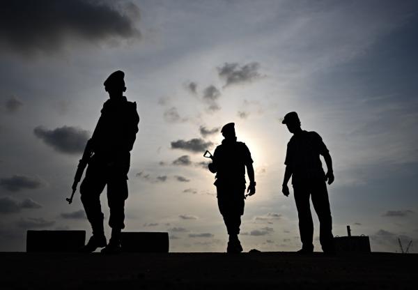 4月23日,在斯里兰卡首都科伦坡,几名士兵在一座酒店附近巡逻