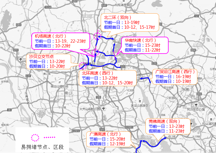 通过历史监测数据,预计今年出城高峰时段与往年相近,主要集中在4月30日(节前一日)13-21时和5月1日(假期首日)9-22时,届时机场高速(三元里至黄石北、平沙至蚌湖)、华南快速(石门堂隧道)、虎门大桥、沙贝立交等节点易发生局部交通拥堵,交通压力主要集中在北部出城方向。建议北部出城市民可绕行广清高速、或经由广从公路进入京港澳高速、或选择G105-G106、S115-S116-G106等继续北上;南部过境车辆可绕行新开通的南沙大桥。