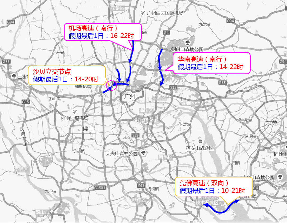 机场高速公路返程时段:为缓解三元里收费站至市区快速路网的交通压力,将根据现场交通拥堵情况,对南行方向黄石南入口实施临时管制。