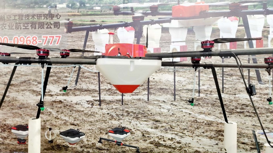 羽人种子精量直播机本身十字型长轴距的机型特点,可以挂载多个(十个)独立直播体,(各个直播体可以方便拆卸,移动)通过调整各个直播体间距及飞行速度或排种轮穴位的间距,可以控制水稻间距及株距,达到成行成垄的目的,种子从排种轮送出时,经涵道风向下加速出仓,直达土壤浅层。直播机由种子仓,排钟轮,加速涵道,导管组成。