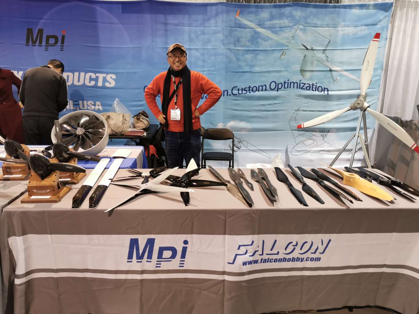 在今年的展会现场,有两家来自中国的企业以联合参展的方式出现在人们的眼前,他们分别是珠海华迈电子模型有限公司(以下简称:华迈电子)以及安阳豪克航空科技有限公司(以下简称:豪克航空)。华迈电子是一家中外合资企业,公司生产和销售的产品包括:电机、电子配件、机械配件和模型等。产品畅销欧美、日韩、澳洲等23个国家和地区。豪克航空是专业设计生产各类飞行器用螺旋桨、旋翼、配件以及相关复合材料部件的厂家.自2000年开始进入模型行业,十多年来从事研发生产模型类螺旋桨、旋翼等复合材料产品,创立了HAWK(豪克)和FALCON两大品牌。