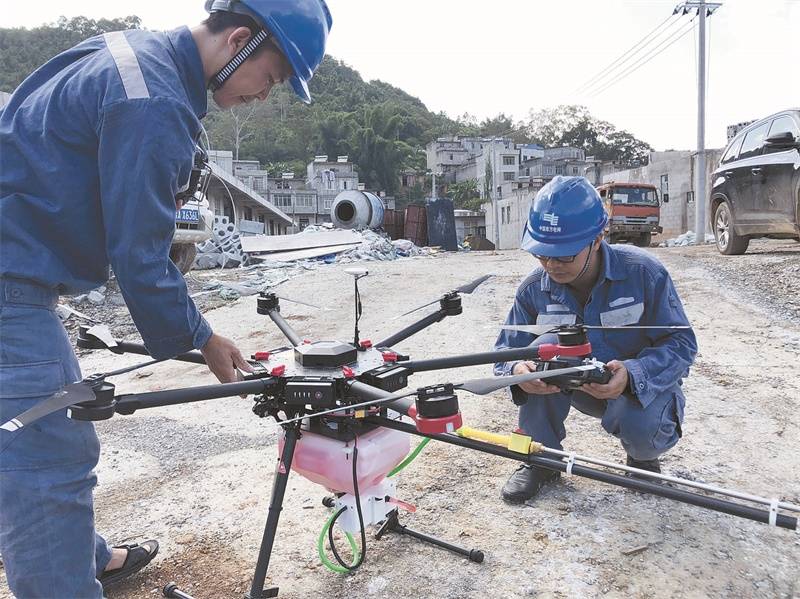 ▲无人机被用于电网线路消缺作业。图为工作人员进行作业前准备