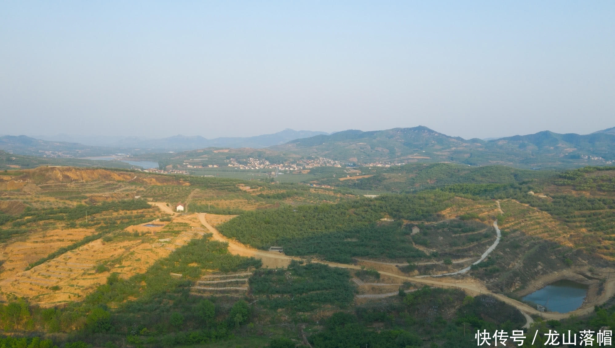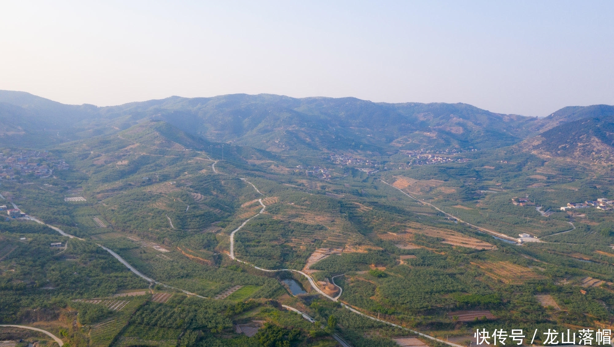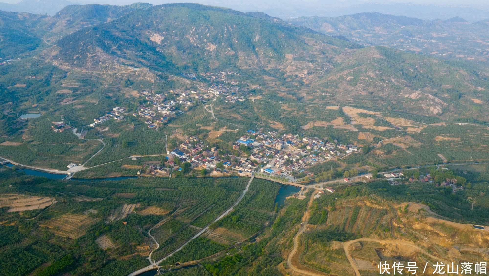 家乡多山,无人机航拍镜头下群山连绵起伏。村民的房子修建在绿色的果园之间,宛如世外桃源。