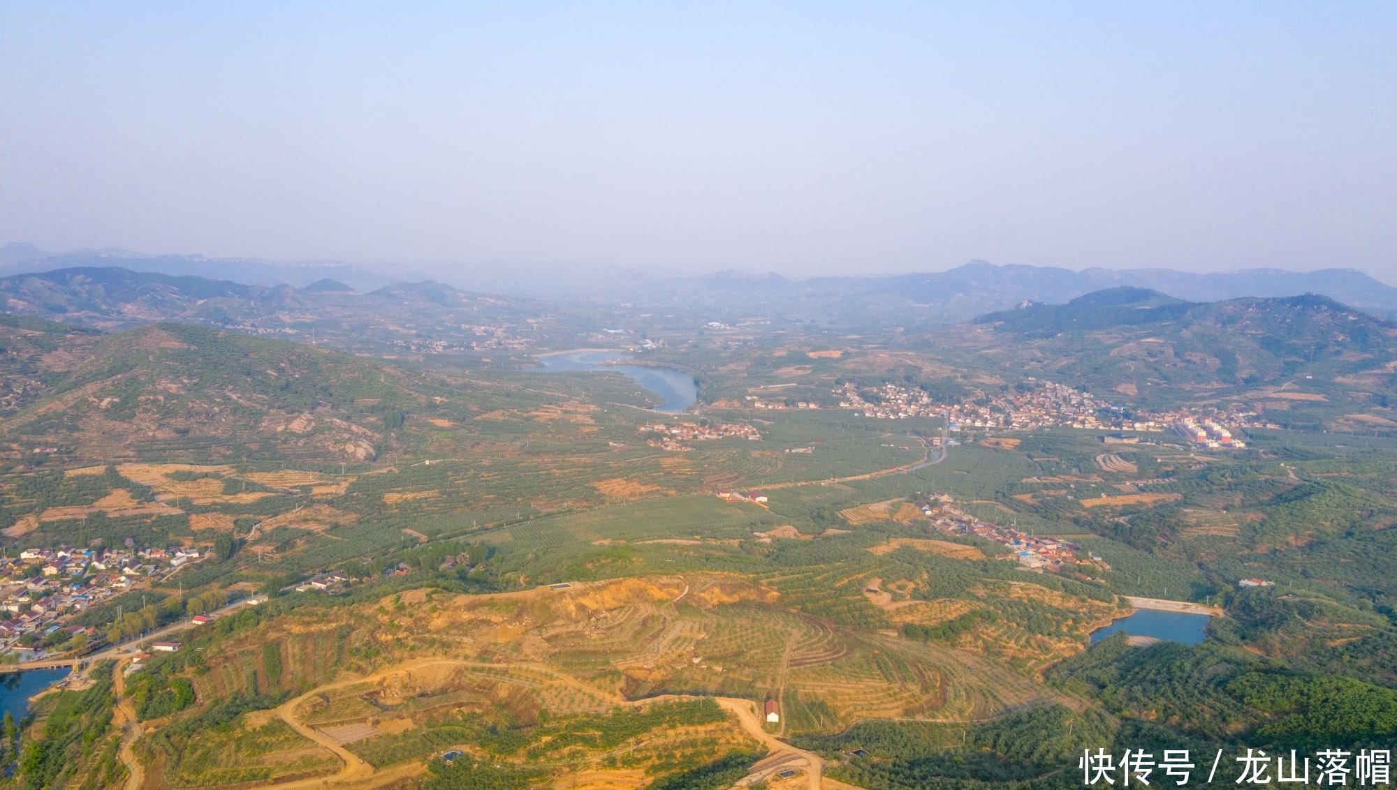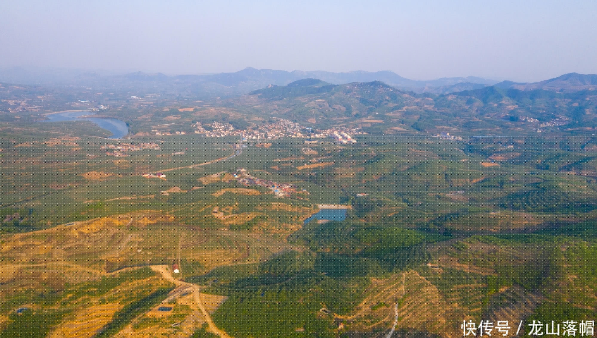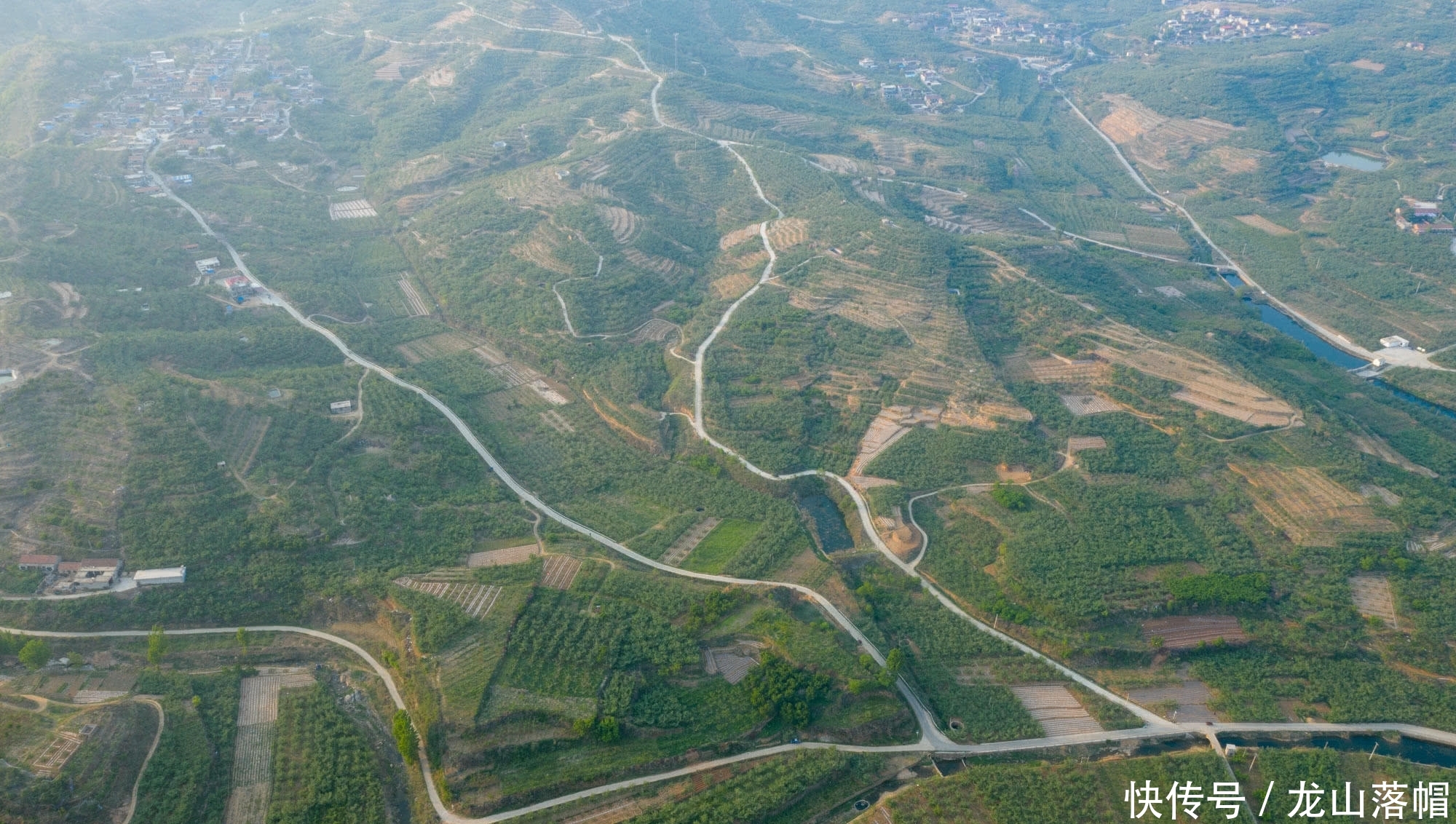 家乡多山,无人机航拍镜头下群山连绵起伏。村民的房子修建在绿色的果园之间,宛如世外桃源。