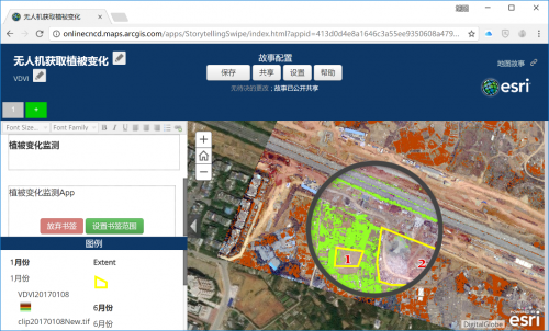 第二步操作中,ArcGIS提供了13类共134种栅格函数,并支持自定义的影像计算流程。通过自定义的影像计算流程,可以在几秒内计算出某区域的绿色植被分布。使用同样的方法,从5个月前的正射影像中提取出绿色植被分布,成果设置为红色。接着可以在本地对比这5个月的植被覆盖变化,也可以将成果发布到ArcGIS Enterprise中。通过滤镜功能不难发现,这5个月内,1号区域由于没有再种植农作物而闲置,2号区域由于施工需要,由农田变为建筑用地。