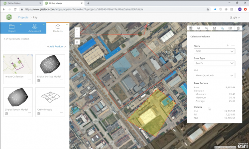白旭阳继续以应急快速成图为例,通过无人机+OrthoMaker,可以在应急场景中快速生成无人机相关影像成果,并可一键转发。他指出,在应急应用场景中,需要迅速掌握特定区域的相关情况。这时只需要飞手运用无人机在高空快速获取该区域的数张影像,然后通过使用ArcGIS OrthoMaker的新建工程,将这些原始的无人机影像拖动到浏览器端,即可完成OrthoMaker的影像上传设置。然后输入一定的相机参数,点击下一步,影像就能自动上传到服务器端。影像一旦上传完毕,后续所有工作都可在OrthoMaker的服务器端完成,整个计算过程无需客户端的等待和继续联网。OrthoMaker可以生成影像集合、DSM、DTM以及镶嵌正射影像四种成果。一般情况下,只需几分钟就能生成相关影像成果并以服务的形式对外共享。在这些成果基础上,可以进行后续操作,如通过卷帘形式快速查看现在与历史影像之间的区别,量算面积和距离、坐标,甚至量取特定区域的挖填方信息等。