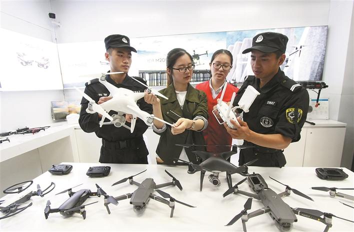 自5月1日起,无人驾驶航空器实行实名登记管理制度,无人驾驶航空器违反规定飞行,以及改装无人驾驶航天器可能危及公共安全的,公安机关可采取扣押机器等相关处罚措施。图为5月5日,路桥区路北街道一家无人机销售店内,路桥公安警航队民警正在宣传无人机实名购买相关规定。