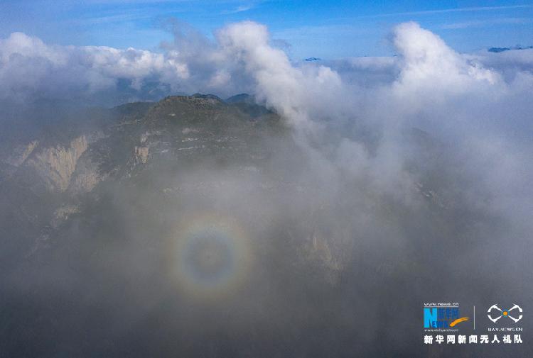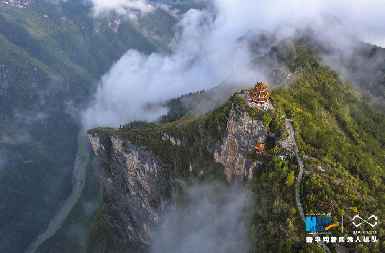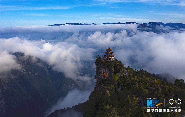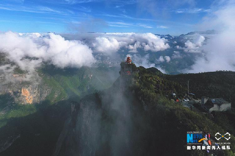 立夏至,重庆市巫溪县云台寺又迎初夏山景。这里海拔1200余米,清晨时段,迷雾绕于山间,云海浮于山头,晨韵壮阔而唯美。图为无人机视角下的云...