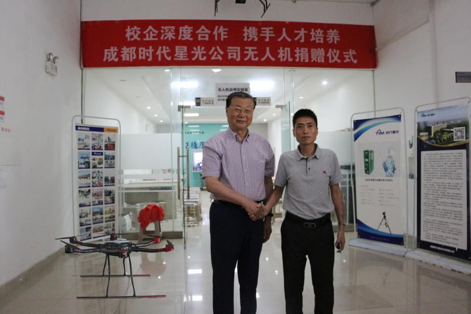 仪式最后,由时代星光科技有限公司董事长彭彦平向四川大学锦城学院院长党委书记邹广严交付了无人机,举行了盛大的揭牌仪式并合影留念。