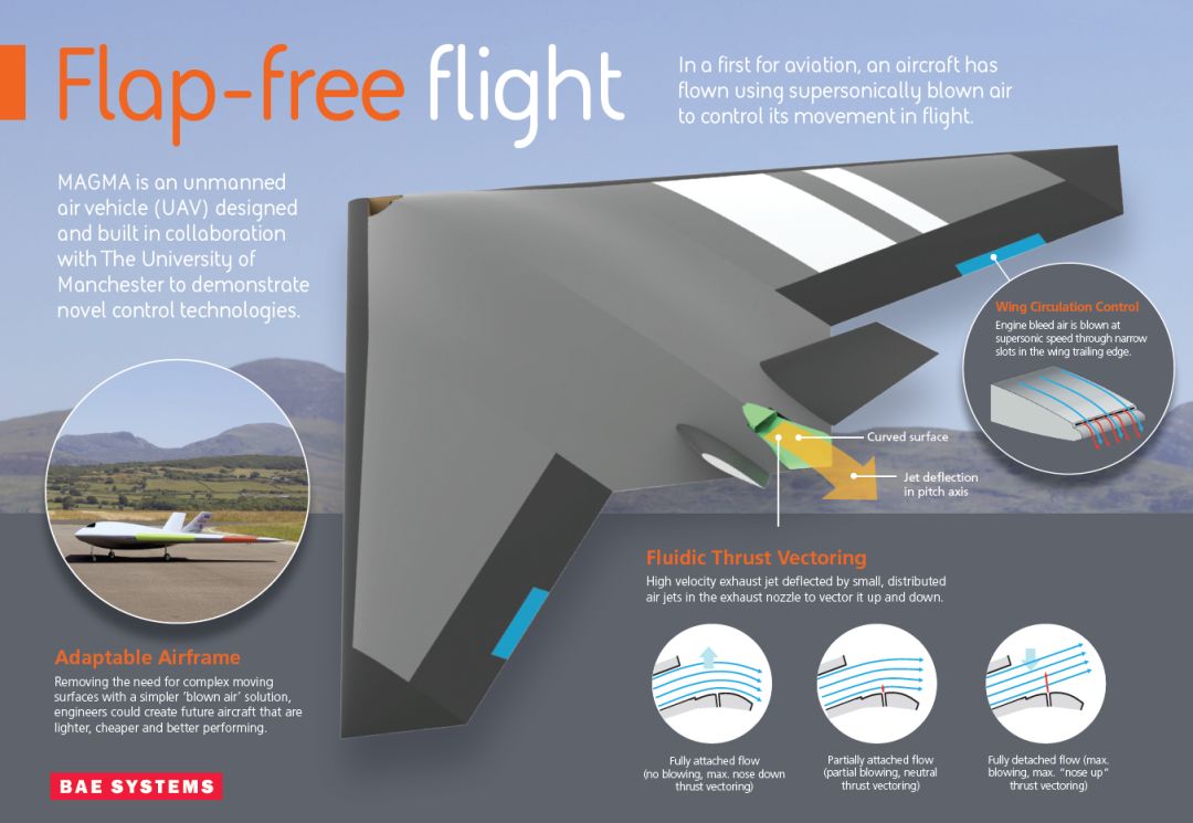 Magma测试了2种无襟翼技术,第一种是将发动机的部分高压喷气引导至机翼后缘狭槽中,然后以超音速“喷出”,第二种则是利用多股从狭缝中吹出的空气偏转发动机喷气。