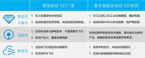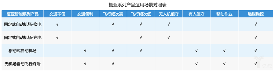 复亚智能已成为大疆核心行业生态合作伙伴、阿里云与阿里IOT生态企业、华为生态合作伙伴,产品广泛应用在高速巡逻、电力巡检、风电巡检、河道巡检、安防巡逻、环保巡逻、气象监测等领域,是首个实现商业应用的工业无人机全自动飞行系统。
