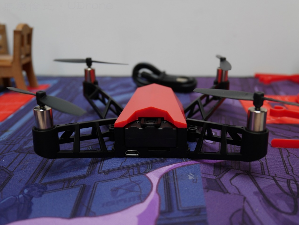 在无人机的底部,主要是有一处用于检测高度的传感器,此外还有开关。在使用时,起飞后的UDrone会自动悬停在1.2米的高度,如果是在飞行中,则可以在过于贴近水平面的时候自动闪避或拉升,保障飞行器的安全。