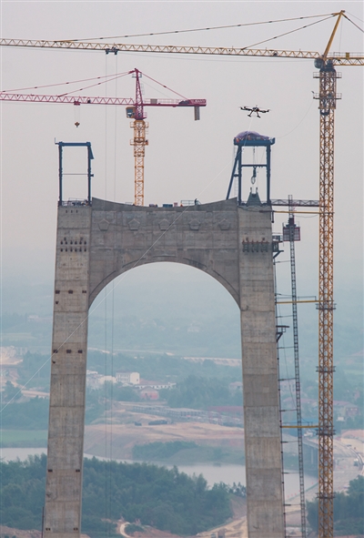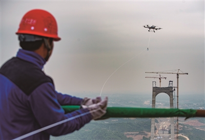 无人机牵引直径2mm杜邦丝,由南岸塔顶起飞。“现在高度是否合理,方向是否正常。”“高度正好,方向正确。”在南岸塔顶上无人机操作手正聚精会神操作着,棋盘洲大桥北岸施工人员通过对讲机反馈飞机实时状态。