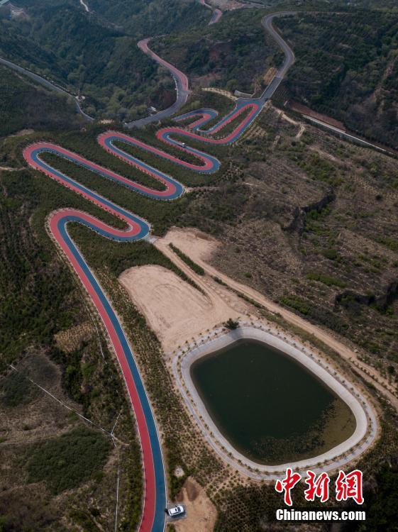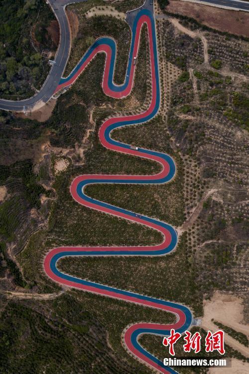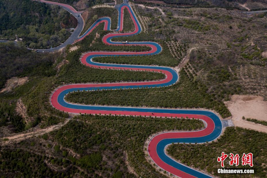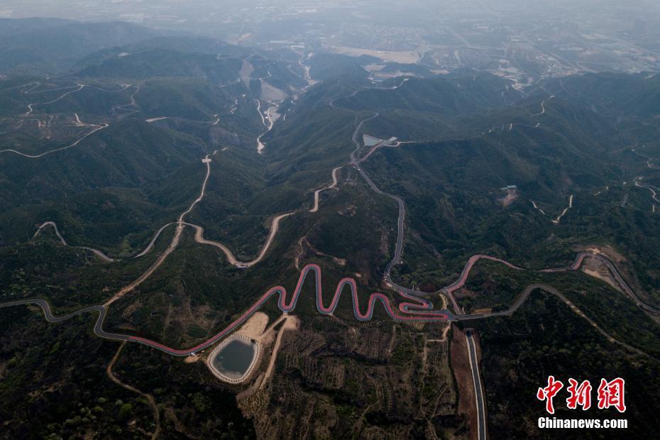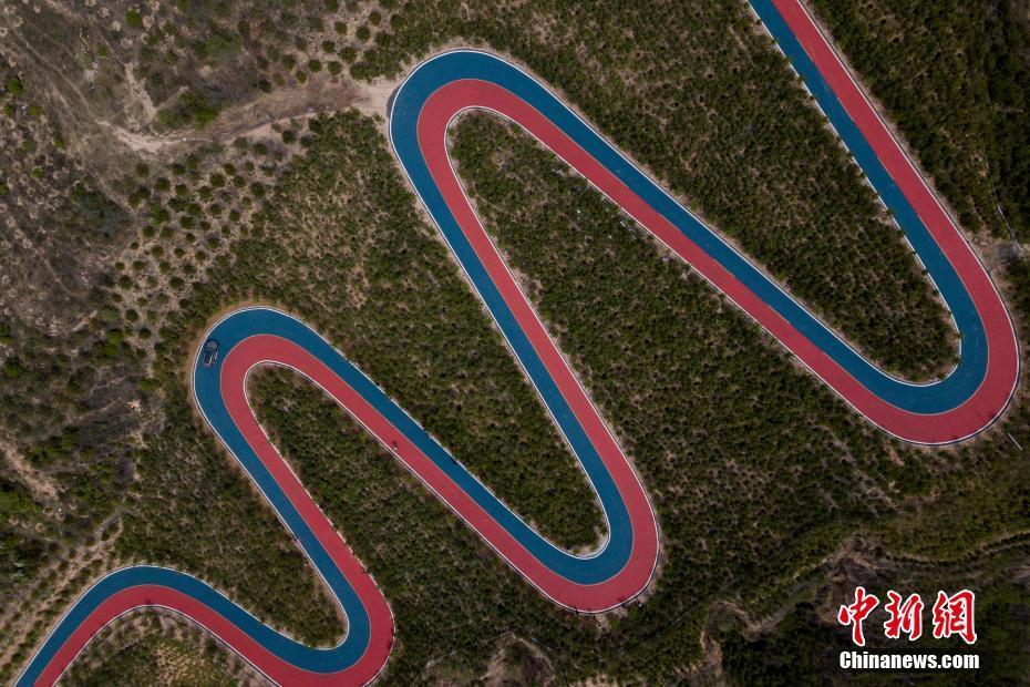 5月7日,山西省太原市,无人机航拍西山旅游公路一段彩色路面。这段公路铺设了红蓝两色沥青,为当地举办国际公路自行车赛专用赛道。从高空俯瞰,这段公路弯弯曲曲,色彩鲜艳,横亘在高海拔山顶,被当地民众称为“云端上的彩虹公路”。