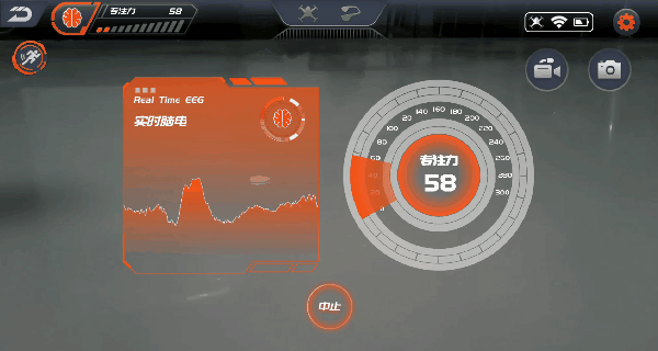 点击意念起飞,再点击确定,这时只需要集中精神提升专注力。当表中的数值超过150,无人机就会自动起飞,并且会自动在空中悬停。操作者可以通过摆头来控制无人机方向。同时还可以通过左上角的三个隐藏图标实现翻滚飞跃、人脸追踪、手势拍照的功能。