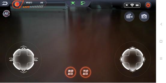 连接成功后,点击开始飞行进入新的界面。这时就可以看到无人机传输的720P实时画面。在最下部有意念起飞和手动起飞两个选项,起飞前需要查看顶部的两个图标是否变成绿色。
