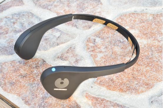 由于笔者不清楚意念机的内部构造原理,所以只能介绍一下产品的外形及佩戴方式。产品的外形看起来像头戴式耳机,但是佩戴的方式却有很大的区别。首先就是图中的黄色触片需要紧贴前额,同时挂耳处的银色部分需要贴近后耳。