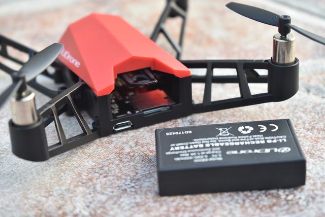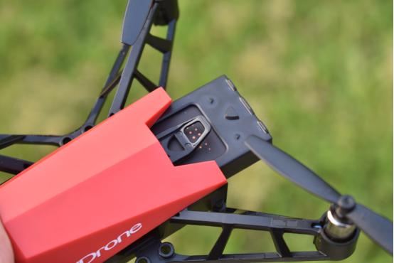 无人机尾部设有电池插槽、TF内存卡插槽、mirco usb充电口。突出的小尾巴是电池的卡口,使电池在飞行的过程中更加的稳固。