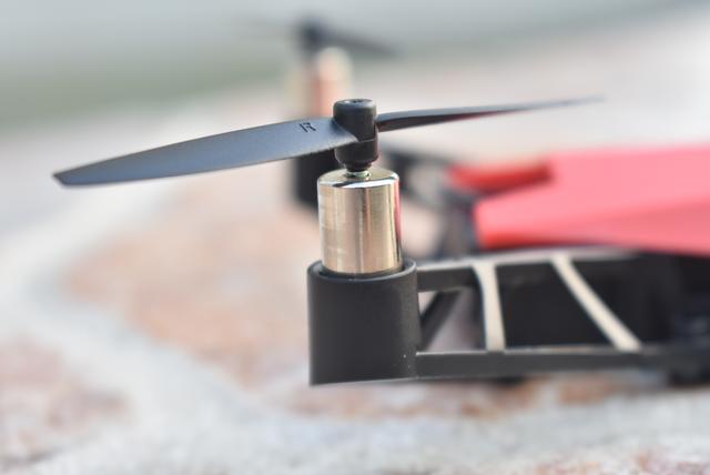 四个银色马达配合螺旋桨看上去很有质感。更换螺旋桨时只需用换桨器把桨叶撬下,安装时对准电机轴下压桨叶就可以卡住,简单快捷。不过在笔者看来,只要学会熟练操控无人机,螺旋桨更换的机率是很小的,因为还有外层的保护罩。