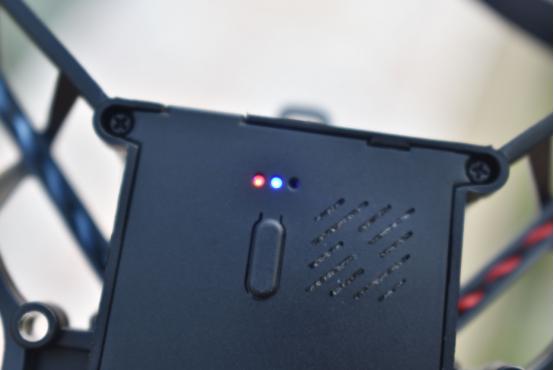 机身头部的菱形双眼实际是设备的工作指示灯,开机时可以通过蓝色灯光的闪烁查看设备状态。当眼部双灯长亮时就进入了解锁待命状态,可以实现操控起飞。