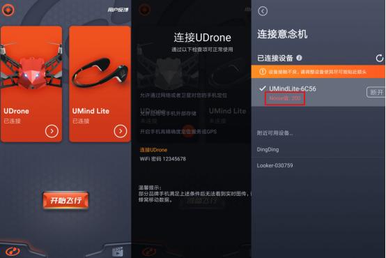 要实现操控需要下载UDrone应用。打开软件需要进行两个连接设置。其中无人机采用wifi热点的方式与手机相连,只需要在手机设置里连接UDrone开头的信号,但是意念机必须在软件里才能配对连接成功。这里有一点很重要,意念机连接成功后,在连接名称下面有一个Noise值,佩戴时需要等到这个值降到100以下,才算佩戴正确,否则无法用意念控制无人机。