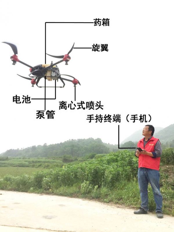 记者观察到,植保无人机比常见的航拍无人机体型大,背负着一个容量10升的药箱。飞手将药箱装好药置于槽内,用手机里下载的操作系统设定航线及各项飞行参数。飞机起飞后,四个泵将药箱里的药通过导管,分别输至螺旋桨下方的离心式喷头内,喷洒出雾化的液体。作业完成后,无人机自动飞回降落。
