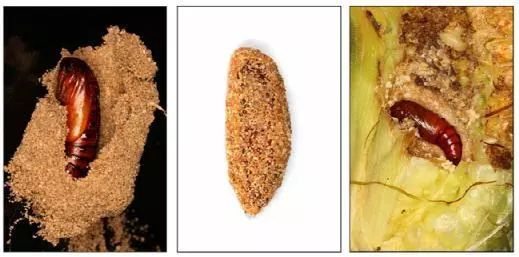 蛹:蛹呈椭圆形,红棕色,长 14-18 mm,宽 4.5 mm。老熟幼虫入土(通常深度为 2-8 cm)做蛹室化蛹,也可在寄主植物的为害部位如玉米穗上直接化蛹。