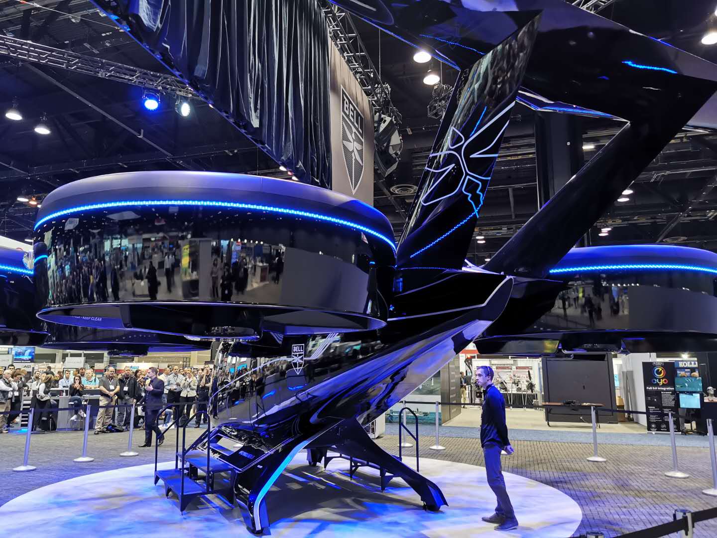 关于动力系统,Bell Nexus采用了混合动力系统,在起落飞行时噪音控制会非常出色。同时,Nexus载人飞行器可搭载4个乘客,可续航1小时,现场有许多观众亲自登驾体验,头顶是液晶显示面板可以实时查看飞行路线及情况。不过,展会现场所展示的只是原型机只用来动态展示,贝尔表示它将于2023年开始测试Nexus。