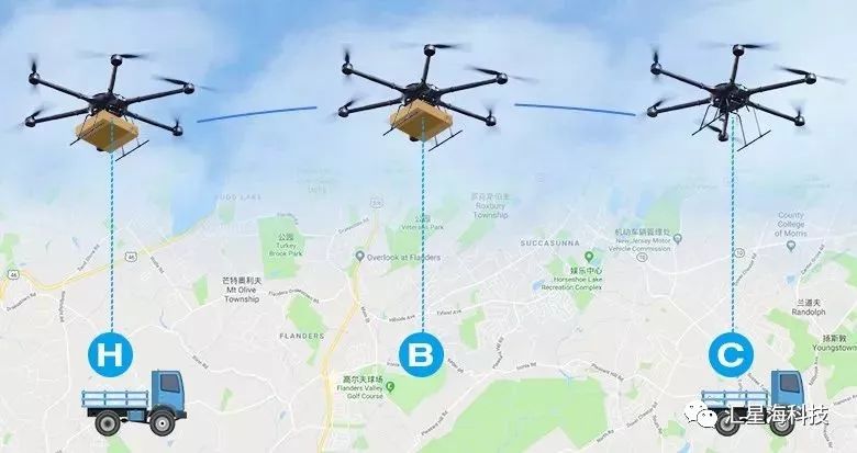 物流车配套无人机从H点起飞前往B点送货,物流车继续行驶前往C点,此时无人机送完货后,即可直接前往C点降落。