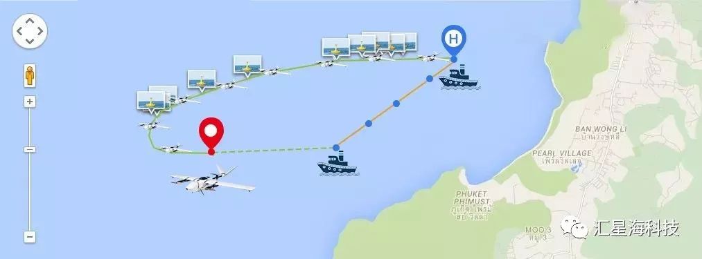 图:轮船在H处时,无人机起飞,记录home点,无人机在海上按规划航线飞行,轮船也开始运动,但H点不变。