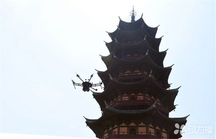 工作人员操控多旋翼无人机对塔身外部进行扫描和拍照