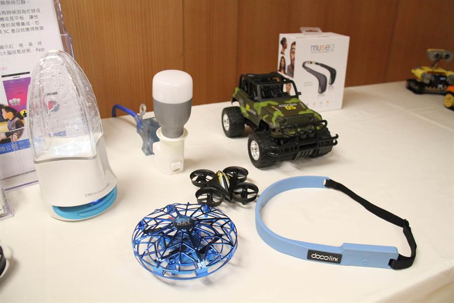 帝壹生医科技公司开发部专案经理黄无名表示,脑控系列产品包括无人机、脑控灯、脑控玩具车等等,都是为了训练儿童的专注力,系统透过对大脑左前额叶电击,将脑压转换成频率,就可以分析使用者专注、紧张等心理状态,设定驱动条件,就可以让无人机飞行、玩具车移动,寓教于乐。