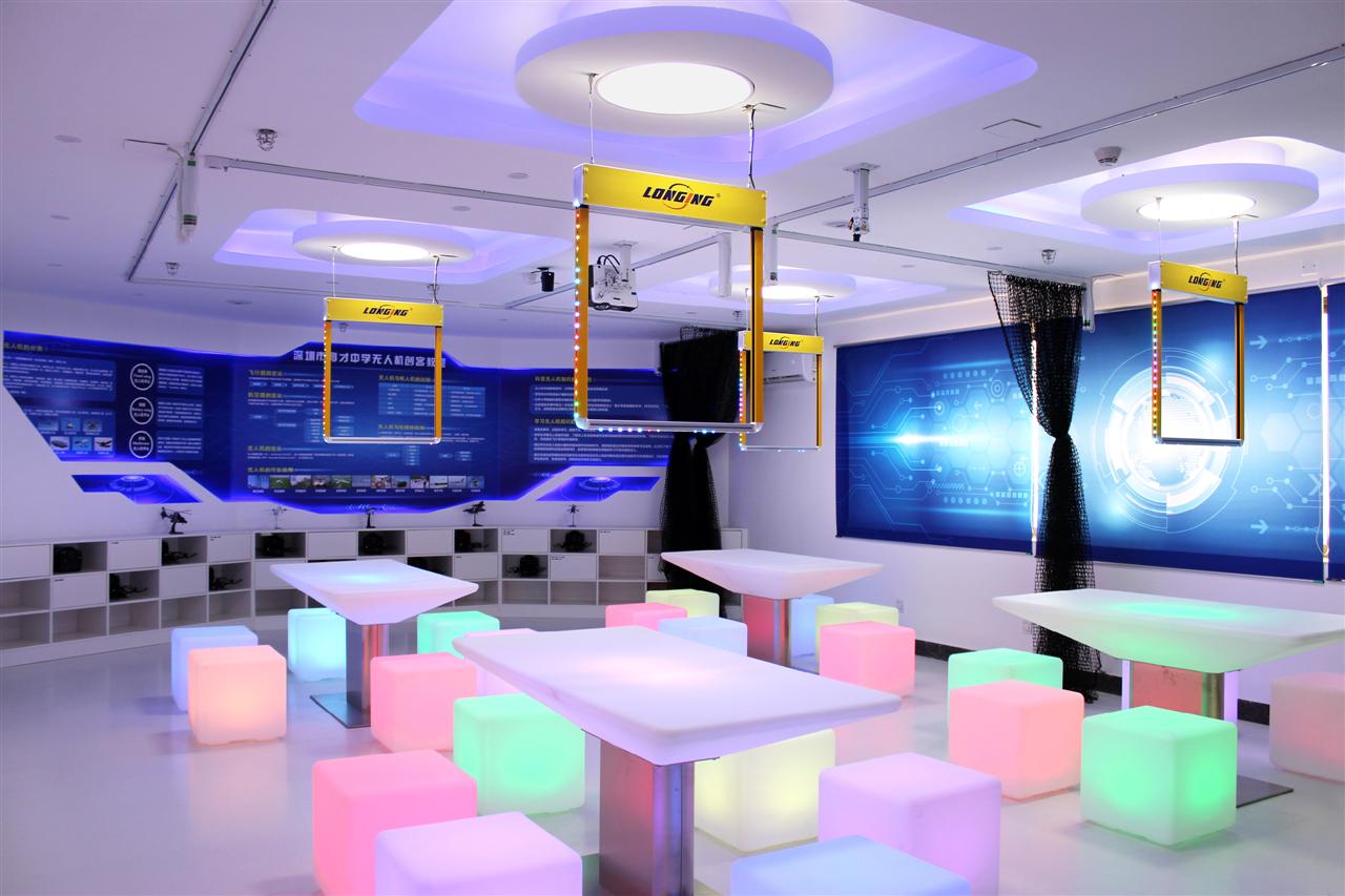 龙云在实验室整体设计上,通过使用物联网技术,将理论教学、组装调试、模拟飞行、飞行实践与成果展示五项功能融合在一间教室里进行,实现教室资源的高效利用。即在一个标准尺寸的教室里设置了结合智能飞行训练系统的桌椅,物联网控制的安全网,混合现实投影飞行训练系统等高科技结合的设备,在兼顾常规教室功能的同时,通过动态的变化,匹配飞行教学的需求。