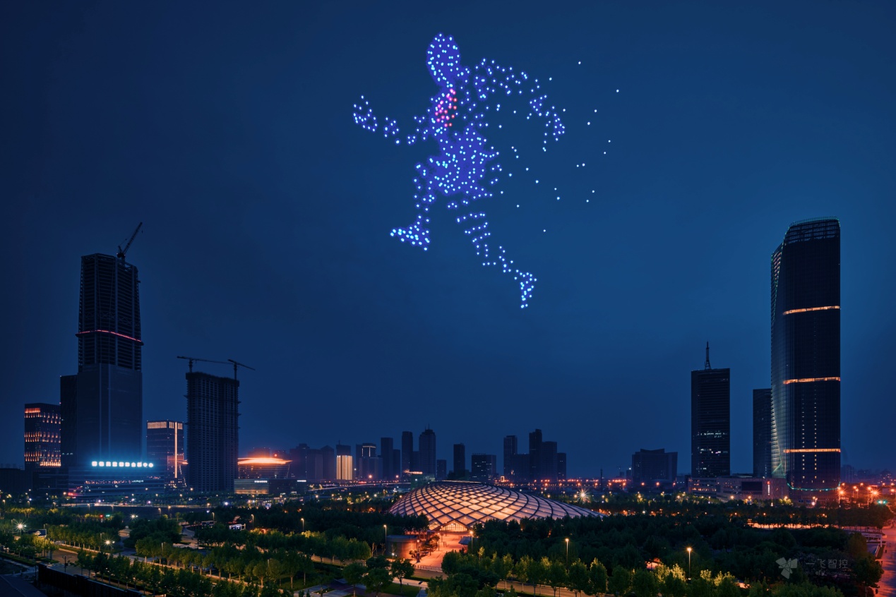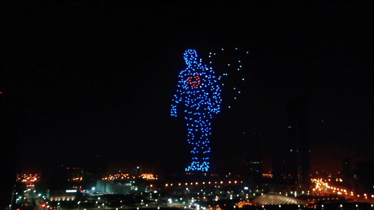 夜幕之下,500架集群无人机在后台智调度系统下腾空,漫天飞舞的无人机光点由二维平面逐步纵深展开,在夜空形成一位“科技之子”,恰似天外来客,奔跑在天津滨海璀璨的夜空,带领观众一起跑步进入智能时代。