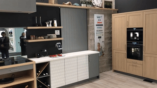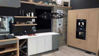 在LivingKitchen 2019展会上,有一块装修完备的厨房展示区。在厨房的一侧,一块高度和宽度均为120厘米的自动玻璃闸门将空间分割成两部分。而这块展示区的主角——TrayDrone无人机就隐藏在这块玻璃门后面。