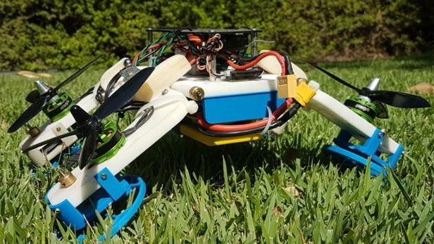 我们已经看到一些能够适应不同运输方式的多功能无人机,例如由英国伦敦帝国理工学院制作的海空两栖无人机AquaMav。而近日由以色列本-古里安大学科学家研发的的新型四轴飞行器也具有多种功能。这种无人机也能像常规四轴飞行器一样飞行,但当撞到地面时会将其螺旋桨臂变为轮子,从而继续移动。