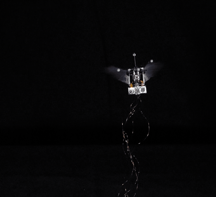(这个蜂鸟机器人在连接能量源的同时就可以自行飞行,但不久还将通过电池供电。图片来源:普渡大学视频/生物机器人实验室)