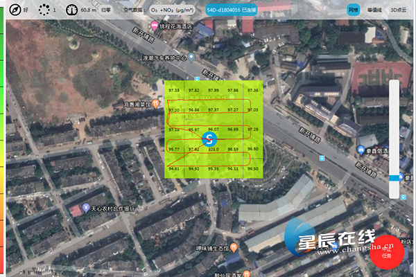 “这架无人机主要用于空气质量监测,此次搭载的设备主要是监测空气中碳化物和硫化物的指标参数,飞行中不断向地面传输检测数据,根据飞行轨迹可在系统中形成直观的参数结果。”来自长沙中斯航迹无人机科技有限公司的技术员指着电脑显示屏上一个模块化的监测结果介绍到,“红色线条代表飞行经过的区域,方块颜色代表监测结果,现在没有超标就是黄色,如果超标,就直接显示为红色。”